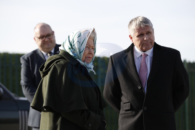 Krolowa Elzbieta II w chustce na glowie podczas wizyty w Wolferton Pumping Station w Norfolk