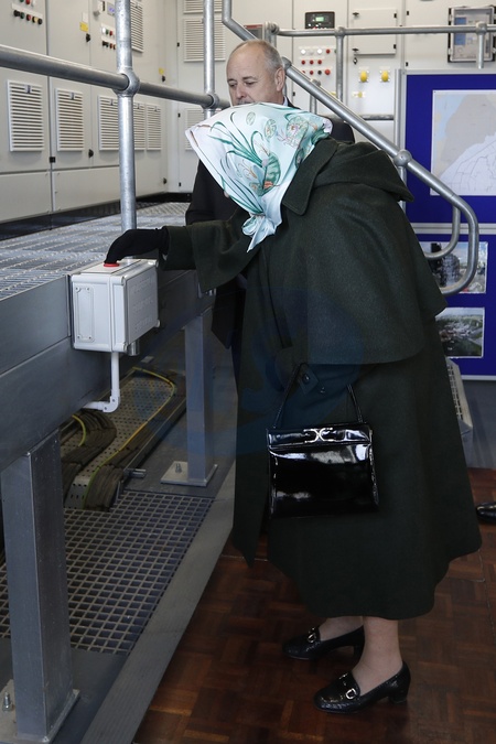 Krolowa Elzbieta II w chustce na glowie podczas wizyty w Wolferton Pumping Station w Norfolk