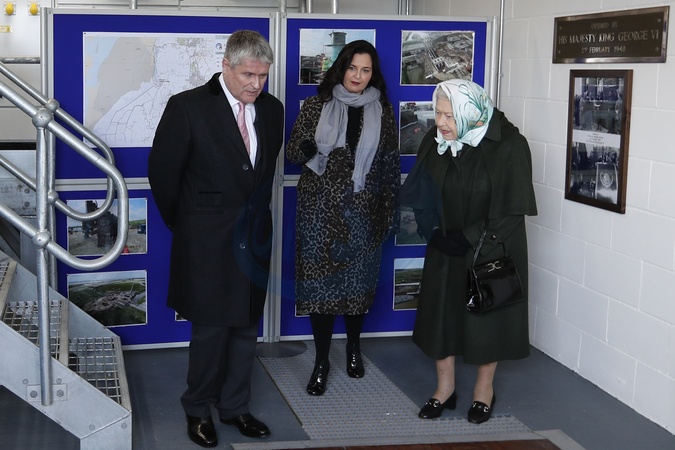 Krolowa Elzbieta II w chustce na glowie podczas wizyty w Wolferton Pumping Station w Norfolk
