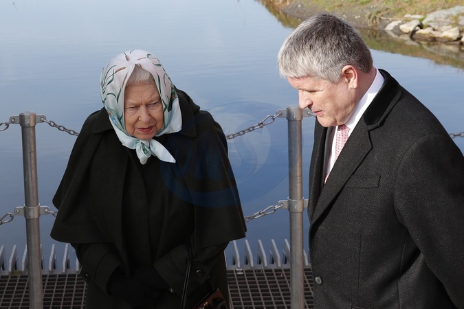 Krolowa Elzbieta II w chustce na glowie podczas wizyty w Wolferton Pumping Station w Norfolk