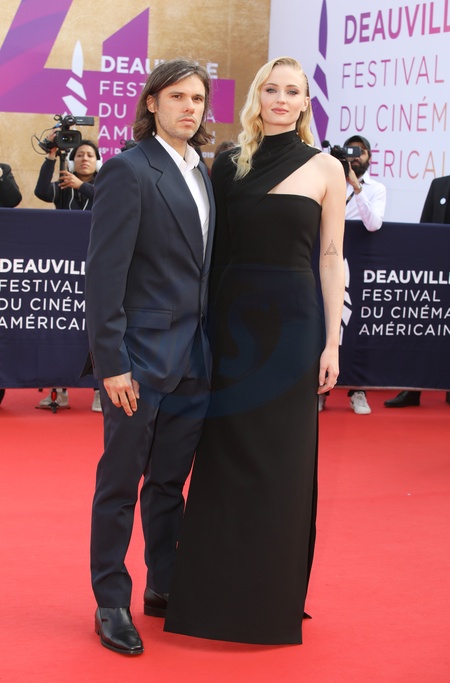 Sophie Turner w czarnej sukni na czerwonym dywanie na Festiwalu w Deauville