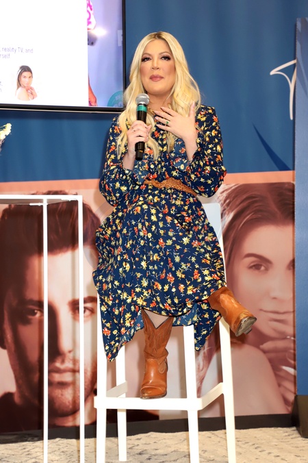 Tori Spelling w kwiecistej sukience podczas wywiadu