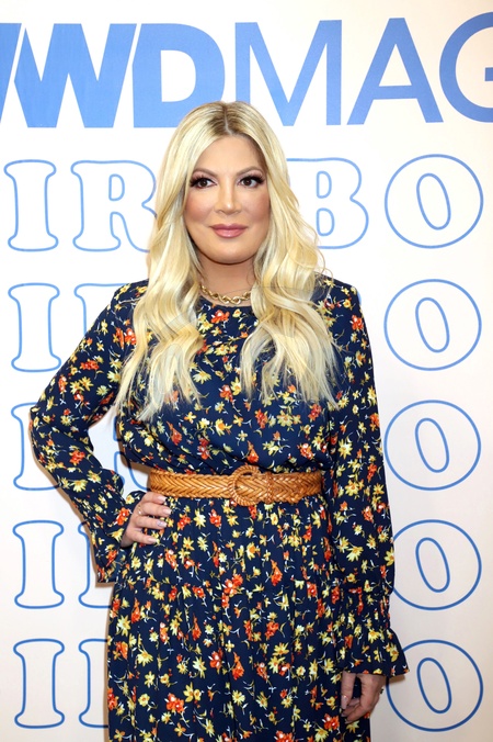 Tori Spelling w kwiecistej sukience podczas wywiadu