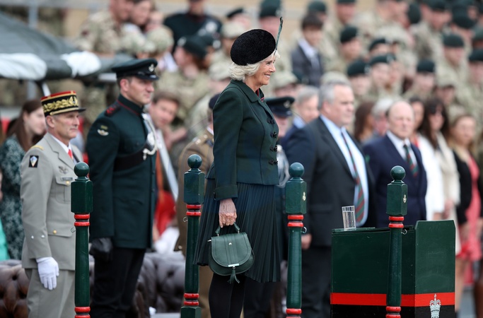 Ksiezna Camilla z duzym piorem na glowie na paradzie Battalion The Rifles