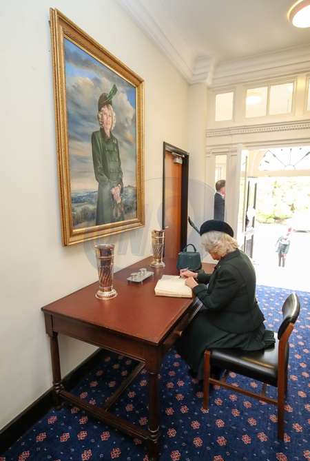 Ksiezna Camilla z duzym piorem na glowie na paradzie Battalion The Rifles