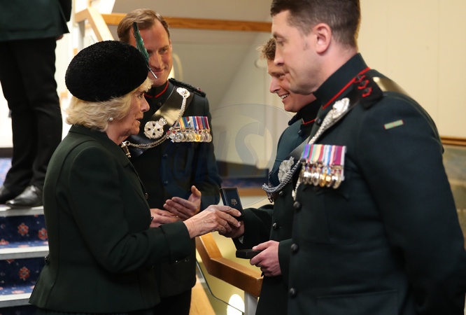 Ksiezna Camilla z duzym piorem na glowie na paradzie Battalion The Rifles