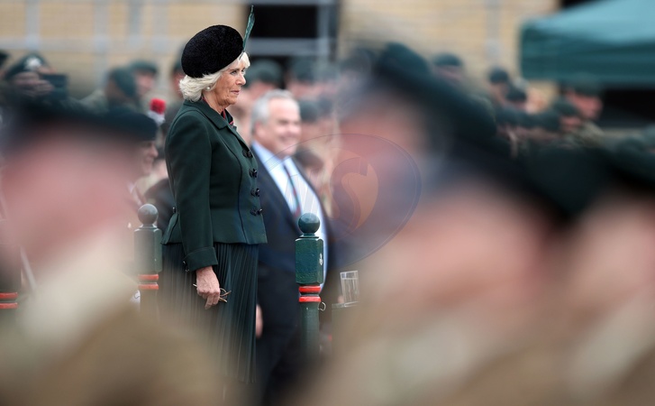 Ksiezna Camilla z duzym piorem na glowie na paradzie Battalion The Rifles