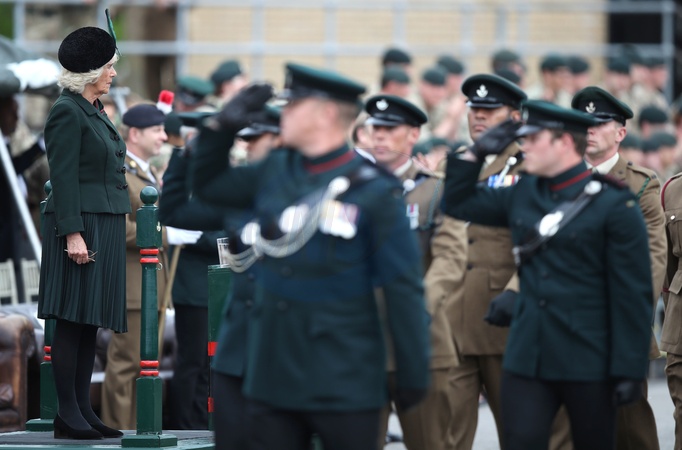 Ksiezna Camilla z duzym piorem na glowie na paradzie Battalion The Rifles