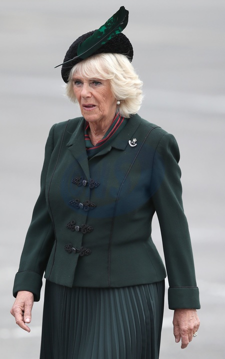 Ksiezna Camilla z duzym piorem na glowie na paradzie Battalion The Rifles