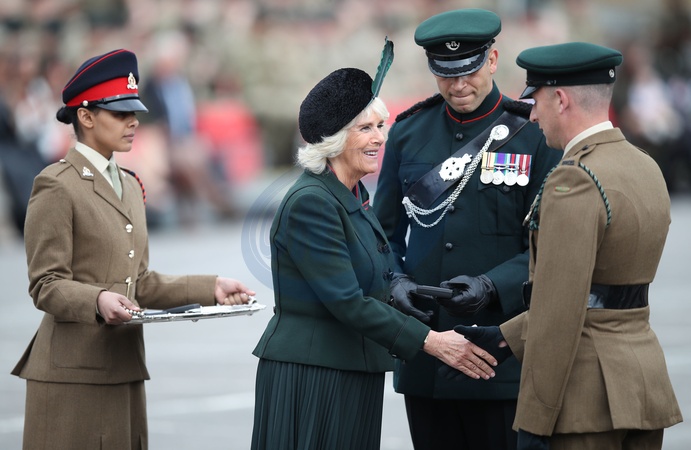 Ksiezna Camilla z duzym piorem na glowie na paradzie Battalion The Rifles