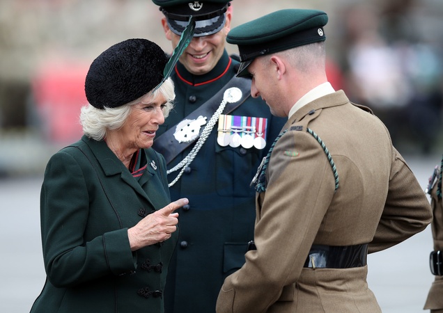 Ksiezna Camilla z duzym piorem na glowie na paradzie Battalion The Rifles