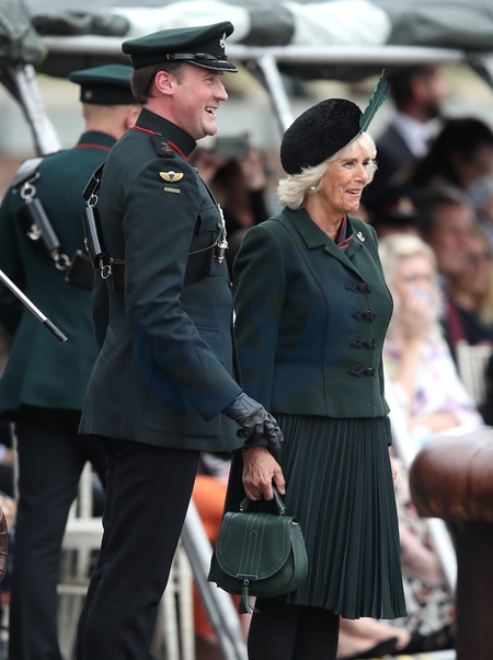 Ksiezna Camilla z duzym piorem na glowie na paradzie Battalion The Rifles