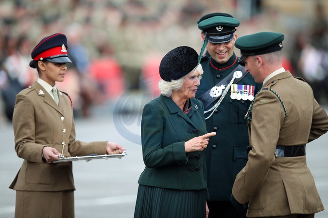 Ksiezna Camilla z duzym piorem na glowie na paradzie Battalion The Rifles