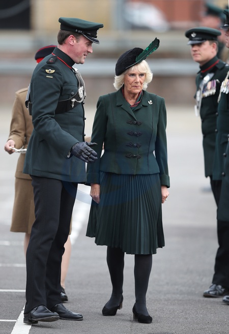 Ksiezna Camilla z duzym piorem na glowie na paradzie Battalion The Rifles