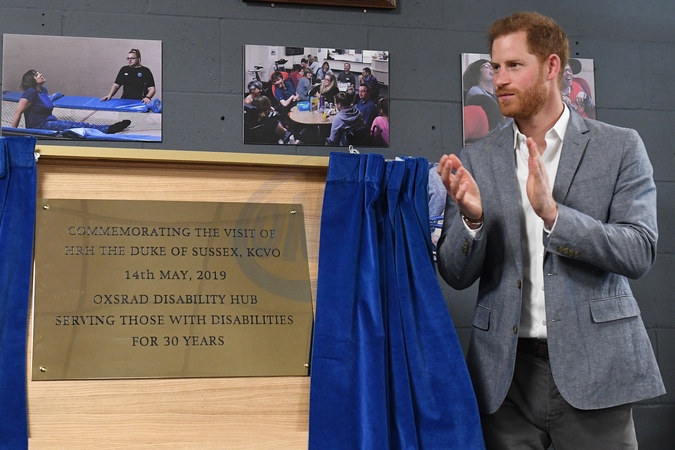 Usmiechniety i zadowolony KSIAZE HARRY podczas wizyty w OXSRAD Disability Sports and Leisure Centre