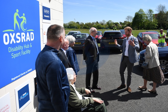 Usmiechniety i zadowolony KSIAZE HARRY podczas wizyty w OXSRAD Disability Sports and Leisure Centre