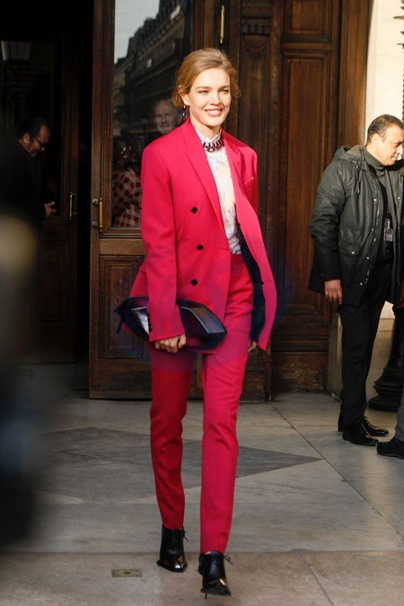 Natalia Viodanova w rozowym garniturze na pokazie Berluti