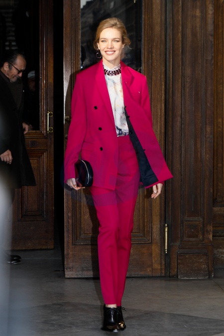 Natalia Viodanova w rozowym garniturze na pokazie Berluti