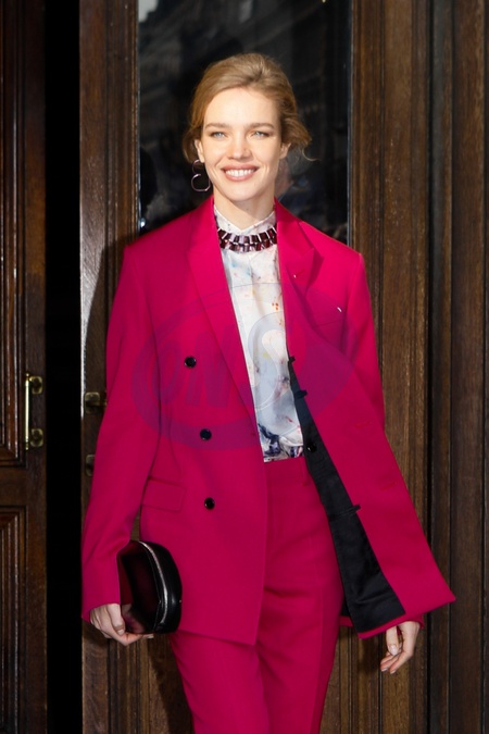Natalia Viodanova w rozowym garniturze na pokazie Berluti