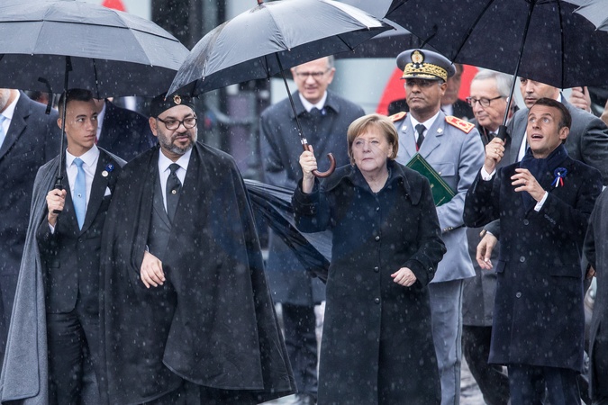 Krol Mohammed VI z Maroka, ksiaze Hassan, Angela Merkel, Emmanuel Macron