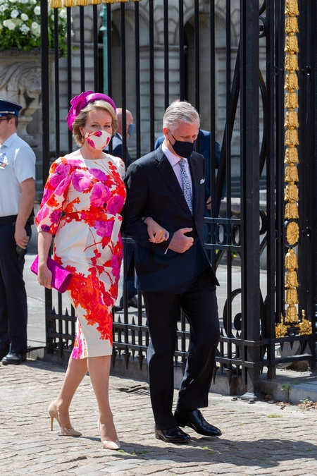 Krolowa Matylda w rozowo czerwonej sukience i jej rodzina podczas swieta narodowego Belgii