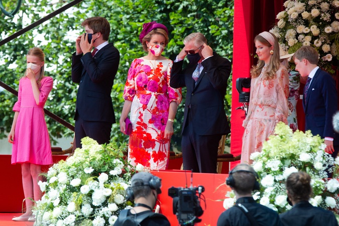 Krolowa Matylda w rozowo czerwonej sukience i jej rodzina podczas swieta narodowego Belgii