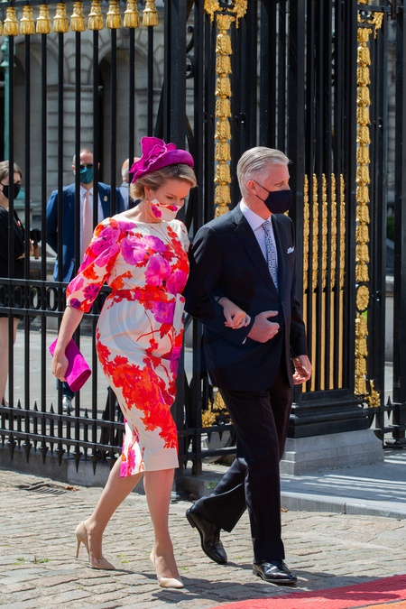 Krolowa Matylda w rozowo czerwonej sukience i jej rodzina podczas swieta narodowego Belgii