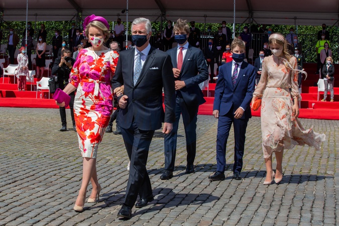 Krolowa Matylda w rozowo czerwonej sukience i jej rodzina podczas swieta narodowego Belgii
