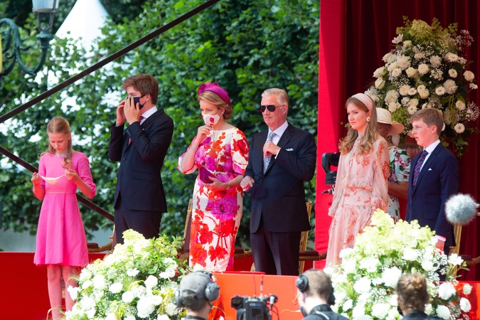 Krolowa Matylda w rozowo czerwonej sukience i jej rodzina podczas swieta narodowego Belgii