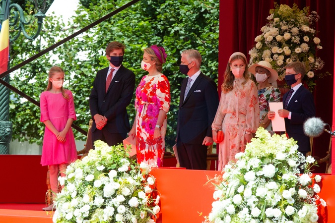 Krolowa Matylda w rozowo czerwonej sukience i jej rodzina podczas swieta narodowego Belgii
