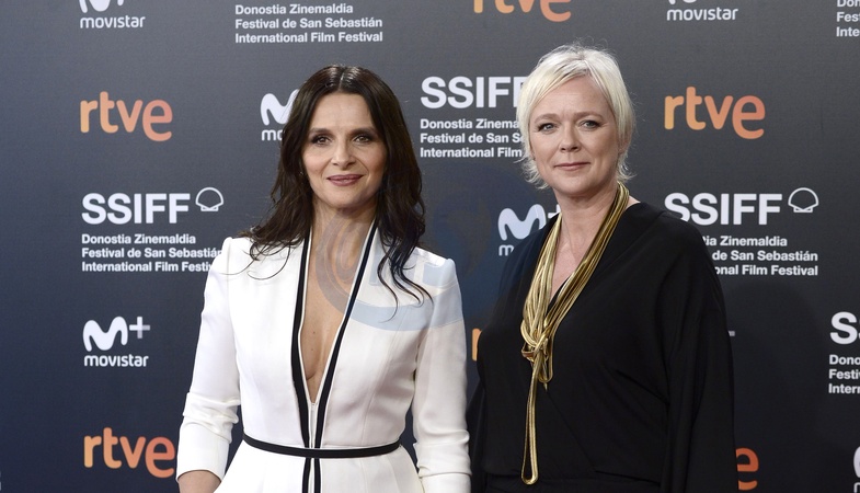 Juliette Binoche w bialej sukni na premierze Vision na festiwalu w San Sebastian