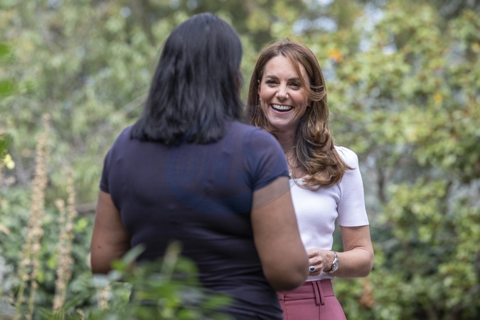 Ksiezna Kate w rozowych spodniach i bialej koszulce