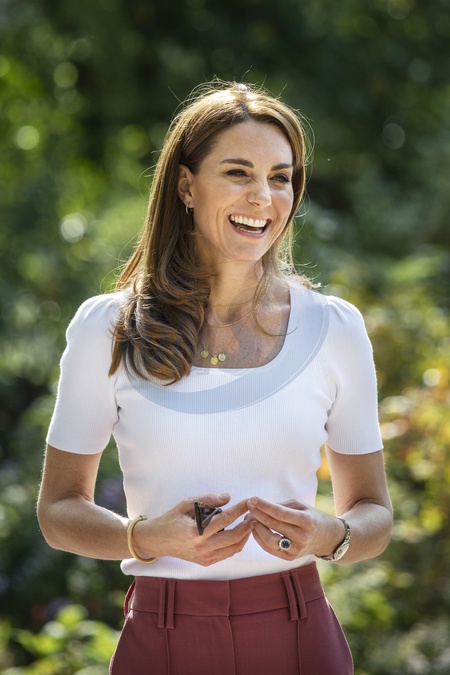 Ksiezna Kate w rozowych spodniach i bialej koszulce