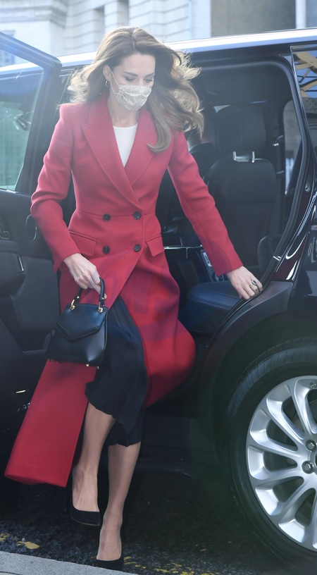 Ksiezna Kate w czerwonym plaszczu i ksiaze William podczas oficjalnego wyjscia
