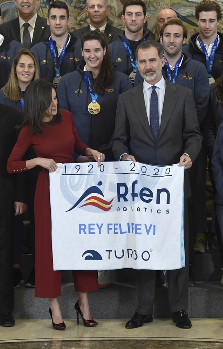 Letizia nabordowo i Filip podczas spotkania z narodowa druzyna waterpolo w Palacu Zarzuela