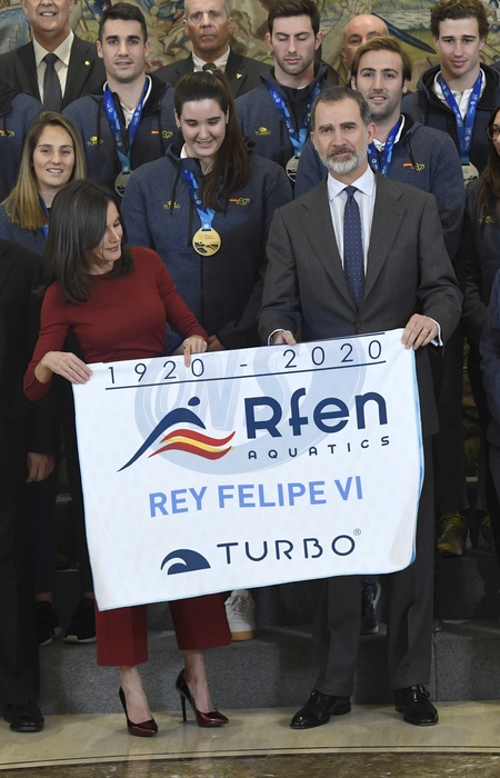 Letizia nabordowo i Filip podczas spotkania z narodowa druzyna waterpolo w Palacu Zarzuela
