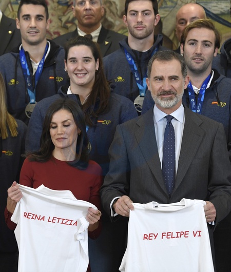 Letizia nabordowo i Filip podczas spotkania z narodowa druzyna waterpolo w Palacu Zarzuela