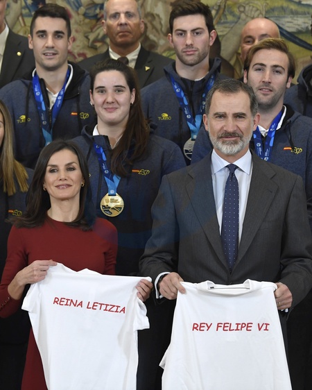 Letizia nabordowo i Filip podczas spotkania z narodowa druzyna waterpolo w Palacu Zarzuela