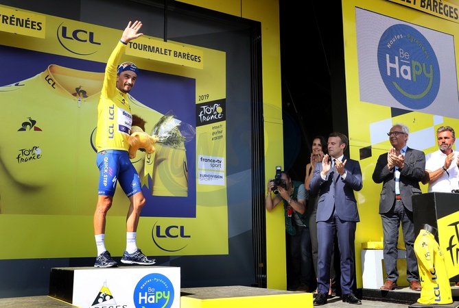 Emmanuel Macron w Tourmalet podczas Tour de France 2019