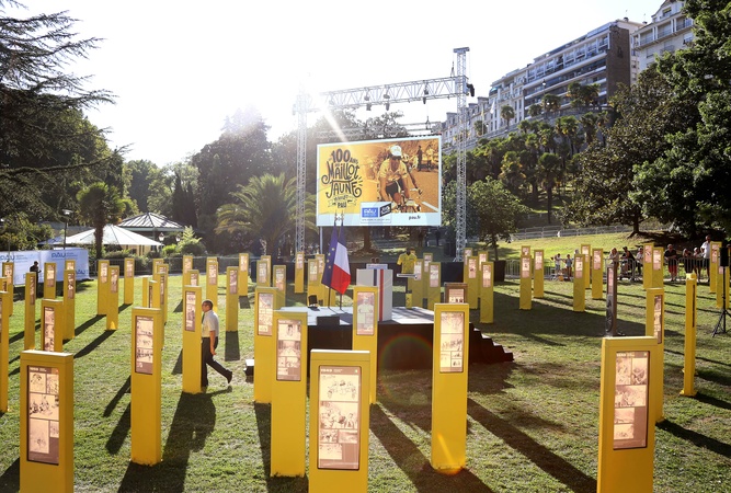 Macron pozuje do zdjec na ceremonii 100-lecia zoltej koszulki