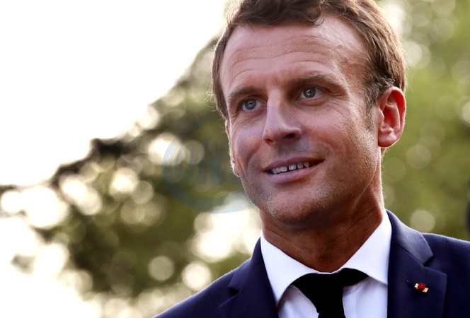 Macron pozuje do zdjec na ceremonii 100-lecia zoltej koszulki