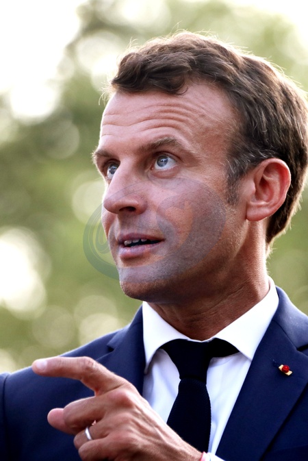 Macron pozuje do zdjec na ceremonii 100-lecia zoltej koszulki