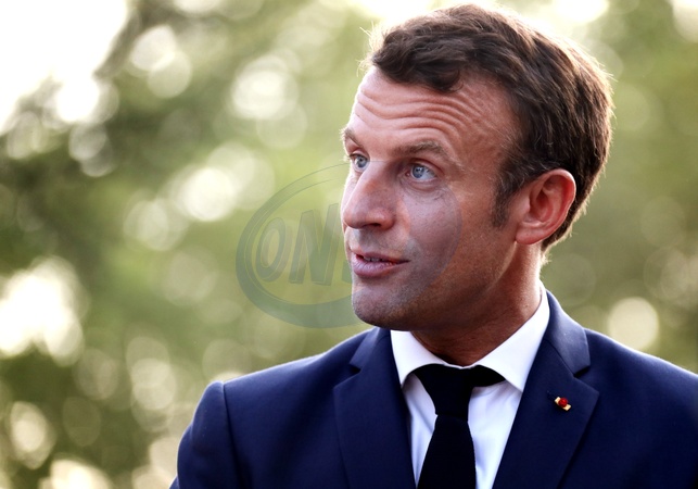 Macron pozuje do zdjec na ceremonii 100-lecia zoltej koszulki