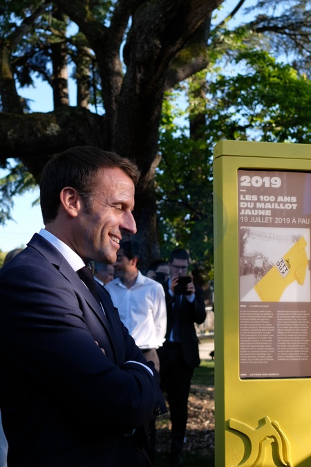 Macron pozuje do zdjec na ceremonii 100-lecia zoltej koszulki