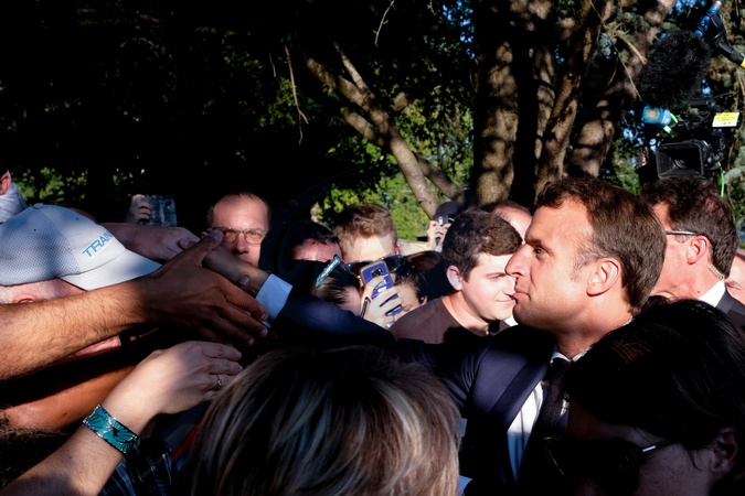 Macron pozuje do zdjec na ceremonii 100-lecia zoltej koszulki