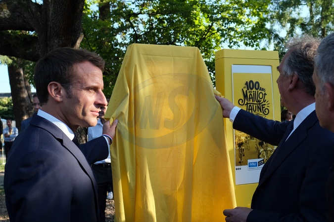 Macron pozuje do zdjec na ceremonii 100-lecia zoltej koszulki