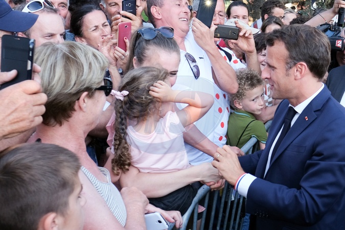 Macron pozuje do zdjec na ceremonii 100-lecia zoltej koszulki