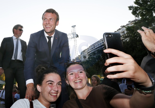 Macron pozuje do zdjec na ceremonii 100-lecia zoltej koszulki