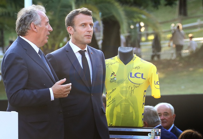 Macron pozuje do zdjec na ceremonii 100-lecia zoltej koszulki