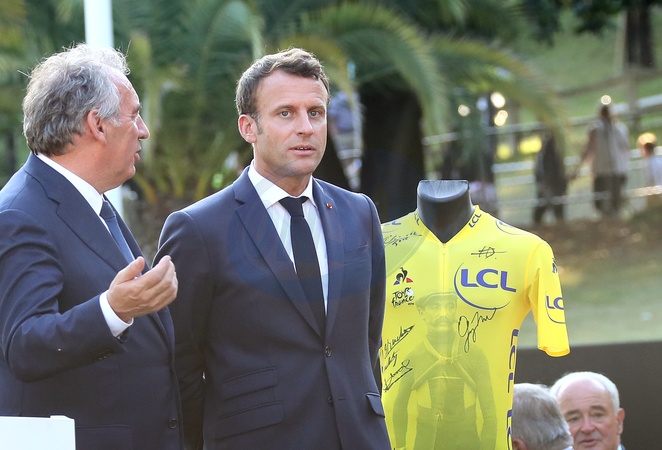 Macron pozuje do zdjec na ceremonii 100-lecia zoltej koszulki